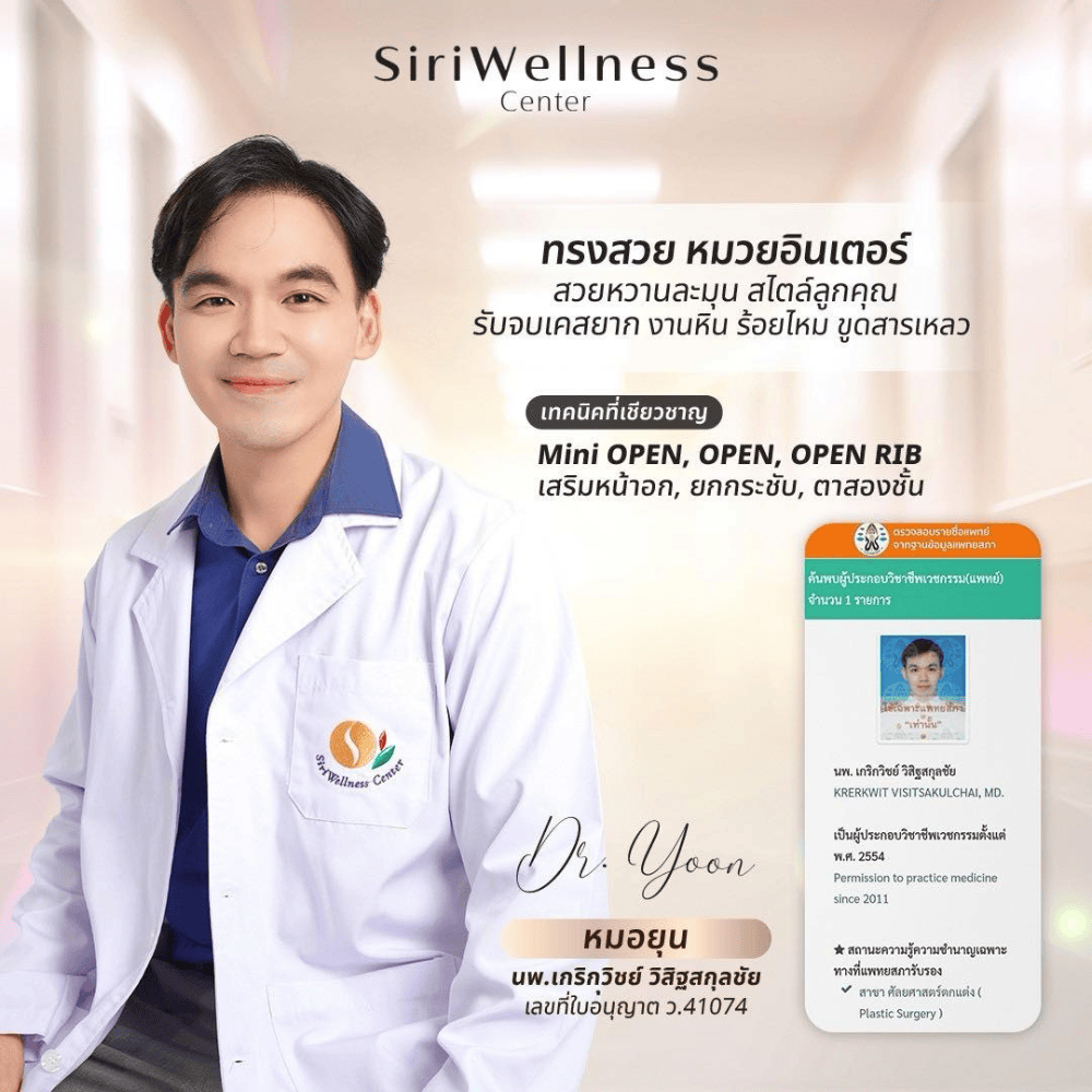 หมอยุน (นพ.เกริกวิชย์ วิสิฐสกุลชัย)ว.41074 แพทยศาสตรบัณฑิต (เกียรตินิยมอันดับ 2), มหาวิทยาลัยมหิดล, ศึกษาต่อใน สาขาศัลยศาสตร์ตกแต่ง จากคณะแพทย์ศาสตร์จุฬาลงกรณ์มหาวิทยาลัย