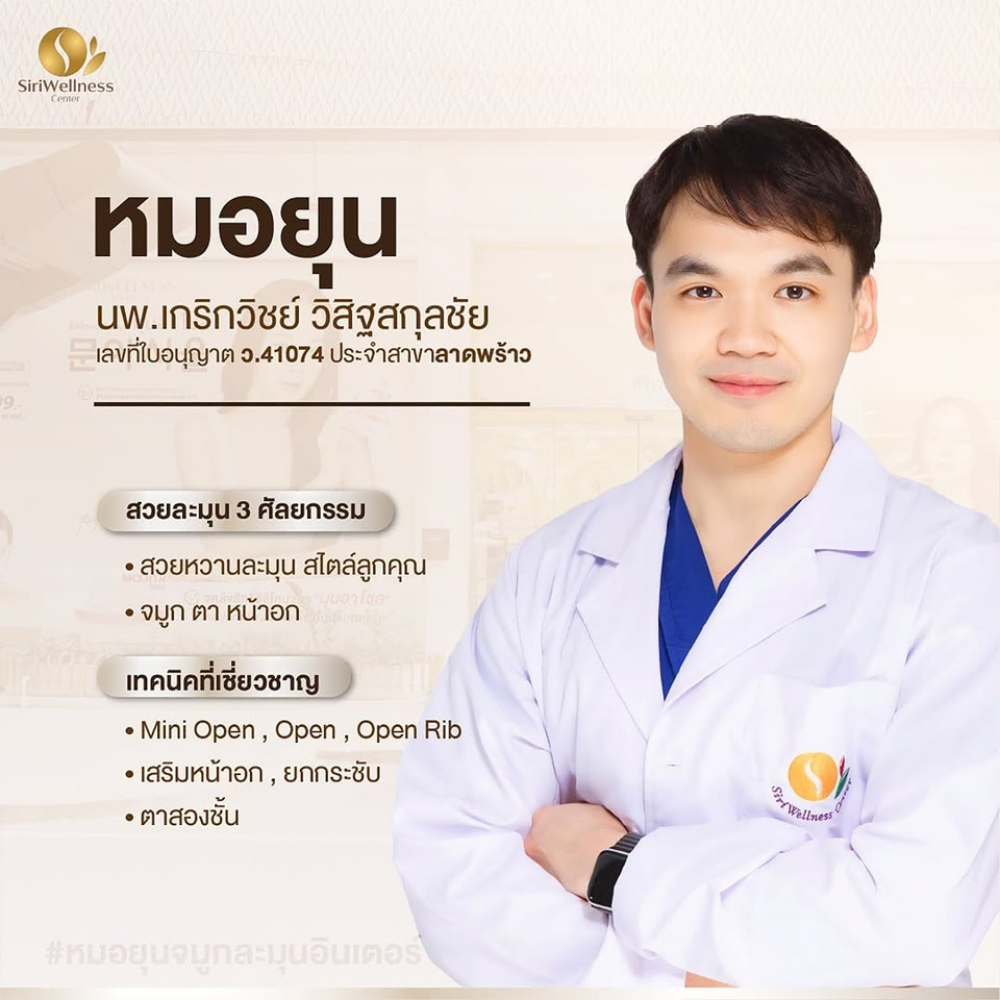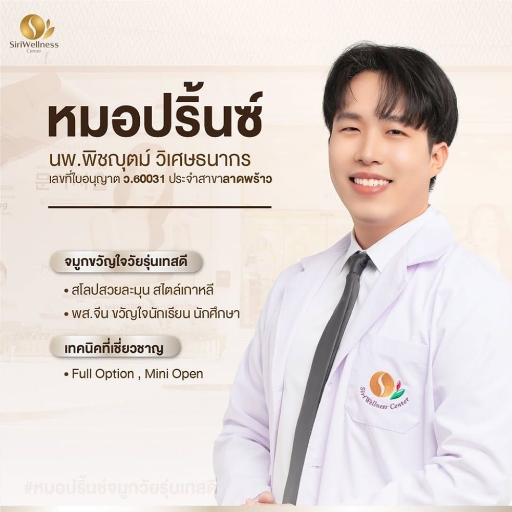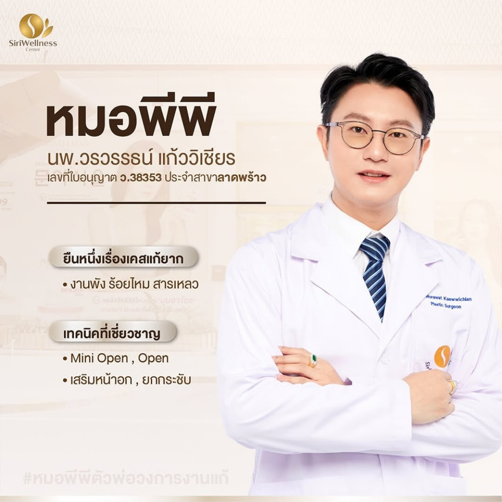 ที่ Siriwellness นั้นมี 5 แพทย์มากประสบการณ์โดยแพทย์จะเหลาซิลิโคนให้เข้ากับใบหน้าของคนแบบเคสต่อเคส โดย 5 แพทย์ที่ Siriwellness ทั้ง 2 สาขาจะมีดังต่อไปนี้