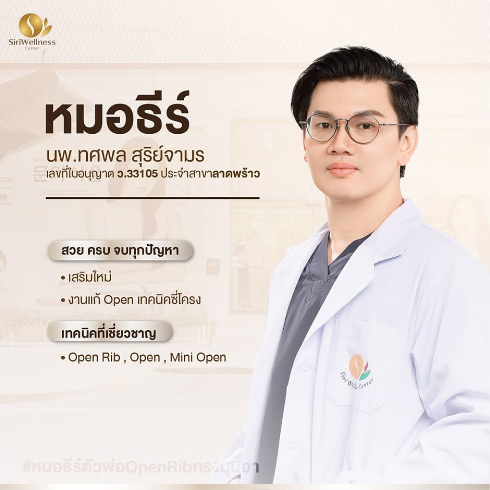 หมอธีร์(นพ.ทศพล สุริย์จามร) แพทย์ศาสตร์บัณฑิต คณะแพทย์ศาสตร์ มหาวิทยาลัยรังสิต อาจารย์แพทย์ด้านศัลยศาสตร์ตกแต่งเฉพาะทาง ว.33105