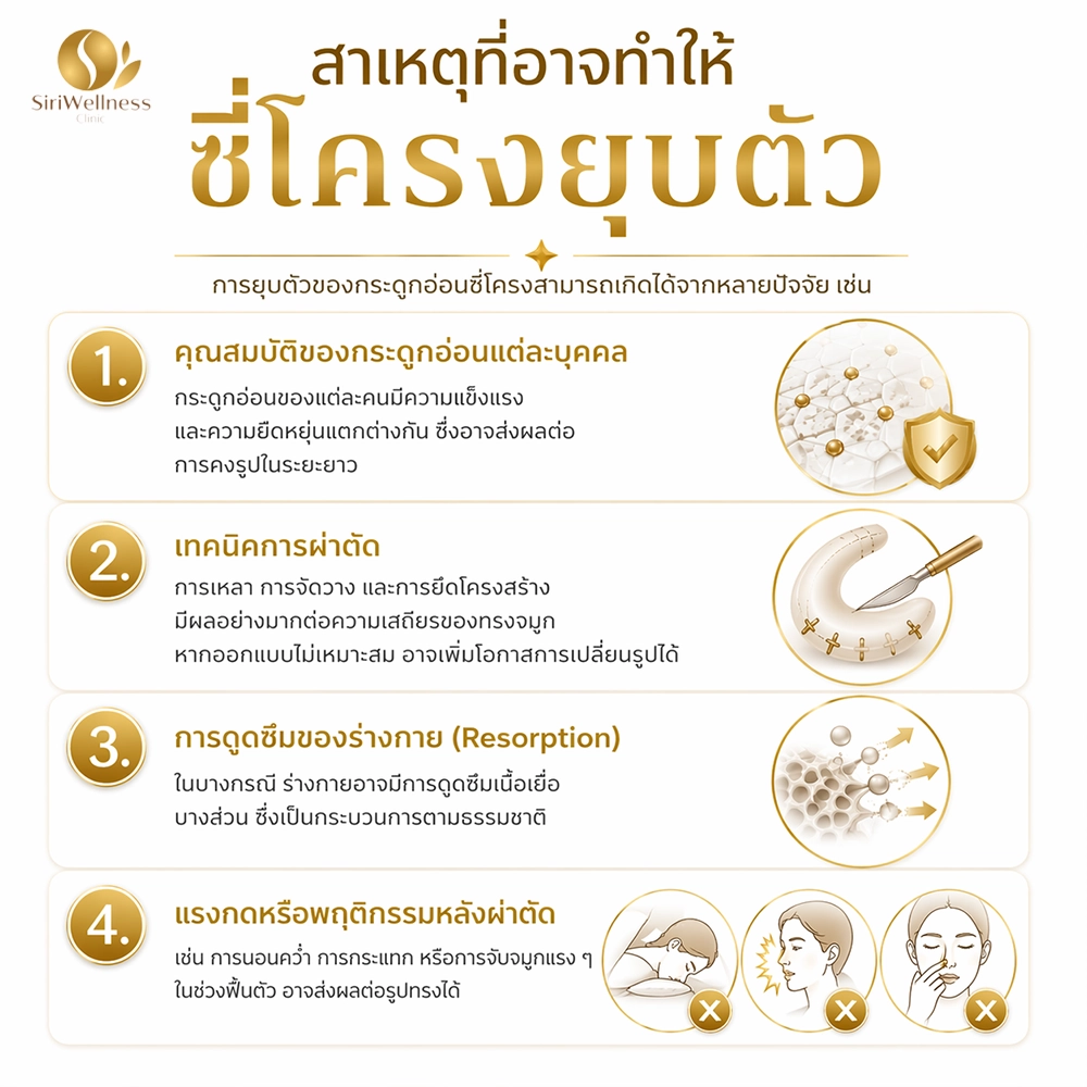 เช่น การนอนคว่ำ การกระแทก หรือการจับจมูกแรง ๆ ในช่วงฟื้นตัว อาจส่งผลต่อรูปทรงได้