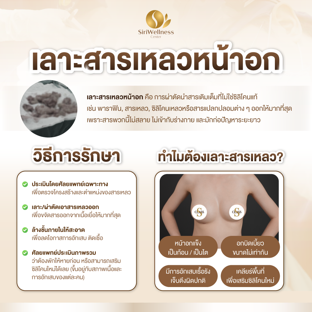 “เลาะสารเหลวหน้าอก” ไม่ใช่แค่การแก้ปัญหาความสวยงาม แต่คือการ คืนความปลอดภัยให้กับร่างกาย หลังจากได้รับสารอันตรายเข้าไปโดยไม่ตั้งใจ การเลือกแพทย์ผู้เชี่ยวชาญและสถานพยาบาลที่ได้มาตรฐานจึงเป็นสิ่งสำคัญที่สุด เพราะหากเลาะออกได้หมดและเนื้อเยื่อฟื้นตัวดี การเสริมหน้าอกใหม่ก็สามารถทำได้อย่างปลอดภัย สวยเป็นธรรมชาติ และกลับมามั่นใจได้อีกครั้ง