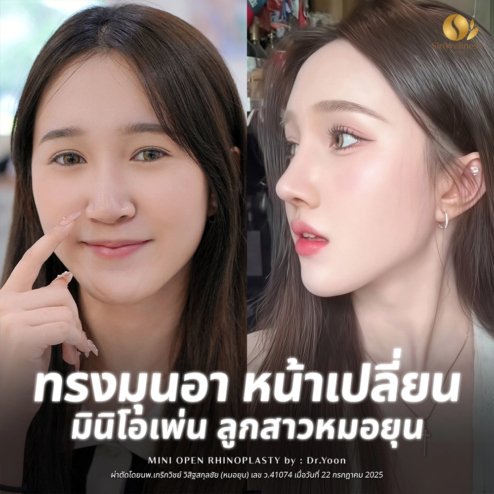 เคสนี้เข้ามาแก้จมูกเพราะทรงเดิมดูแข็ง ปลายทู่ ปีกจมูกกว้าง และขาดความละมุน ทำให้ใบหน้าโดยรวมดูไม่มีมิติ คุณหมอยุนเลือกใช้เทคนิค Mini Open เพื่อเปิดโครงสร้างเฉพาะส่วนที่จำเป็น ลดอาการบาดเจ็บของเนื้อเยื่อ พร้อมปรับฐาน ปลาย และสันจมูกอย่างประณีต