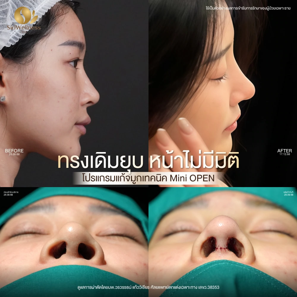 เคสนี้เป็นผู้ที่เคยผ่าตัดจมูกมาแล้วหลายครั้ง และมีปัญหาฐานจมูกเอียง รวมถึงรูจมูกไม่เท่ากัน ส่งผลต่อความสมดุลของรูปหน้า หลังการประเมินพบว่าจำเป็นต้องปรับโครงสร้างภายในอย่างละเอียด คุณหมอพีพีจึงเลือกใช้เทคนิค Open เพื่อให้สามารถจัดแนวฐานจมูกและแกนจมูกได้เหมาะสมมากขึ้น หลังการผ่าตัด รูปทรงจมูกโดยรวมดูสมดุลและมีมิติมากขึ้น